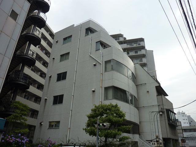 1987年竣工のオフィスビル、新耐耐震基準をクリアした建物です。白いタイル張り、丸みを帯びた外観です。