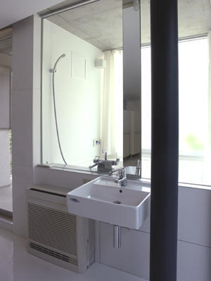 コンクリート打ちっぱなし・ガラス張り・池と