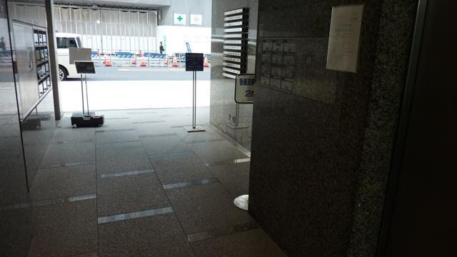 1993年竣工、シルバーのパネル張りのすっきりとした印象のオフィスです。エントランスは清潔感があります。