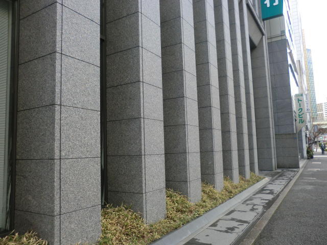 2001年竣工、グレーの石造りの外観は重厚感があります。1階には銀行があり目印になります。