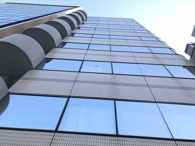 タイル張りの外観に大きな窓面が印象的な建物です。1990年竣工のオフィス、新耐震基準をクリアしています。