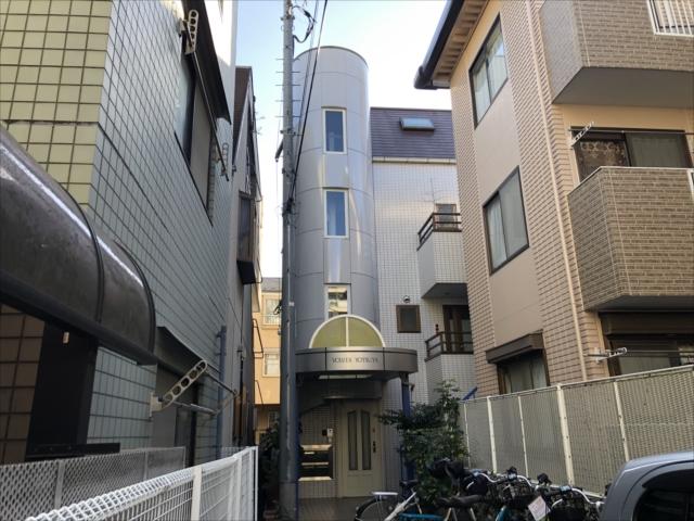 1993年竣工、白いタイル張りの外観の清潔感のある建物です。住宅街の中の路地を進んだ先に立地していますので、隠れ家のようなオフィスです。