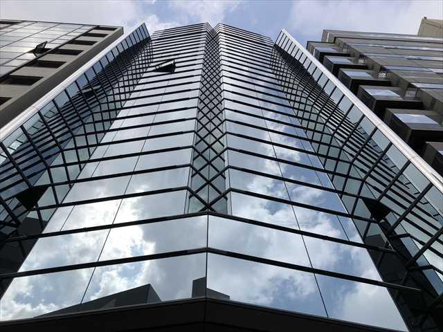 ガラスカーテンウォールの存在感のある外観の建物です。1989年竣工で新耐震基準をクリアしています。