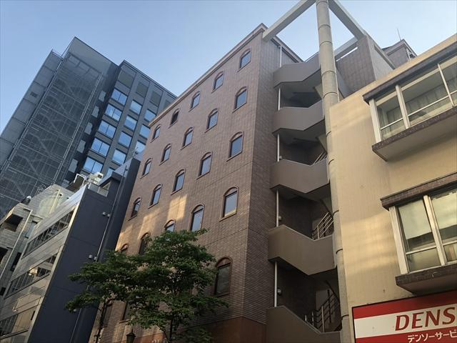 外観は明るいグレーのタイル張り、大通りから少し入った場所に立地しています。