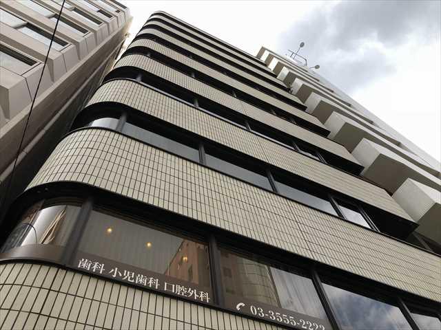 1985年竣工、白いタイル張りの外観の建物です。永代通りから1本入った場所に立地しています。