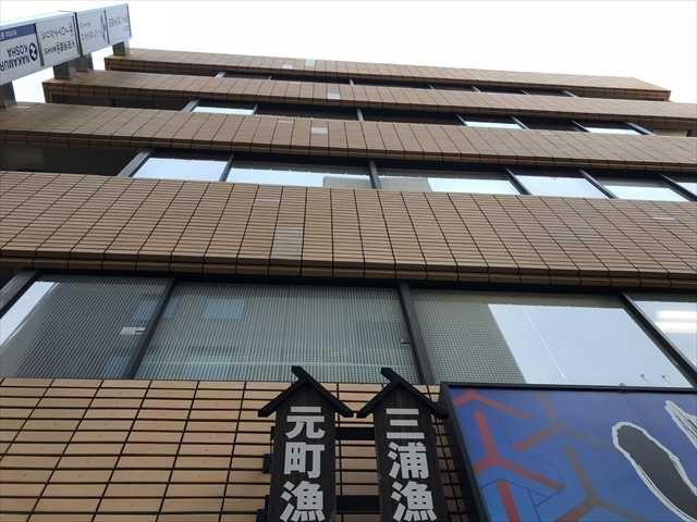 1983年竣工、薄い茶色のタイルがアクセントの建物で、1階は飲食店になっています。