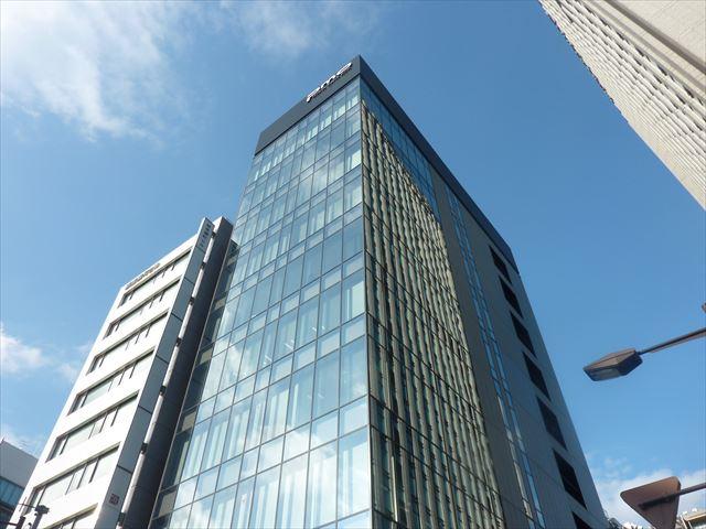 前面ガラス張りのスタイリッシュな外観、天井高2.7メートル超で開放的なオフィス空間です。