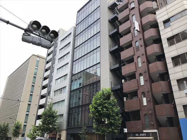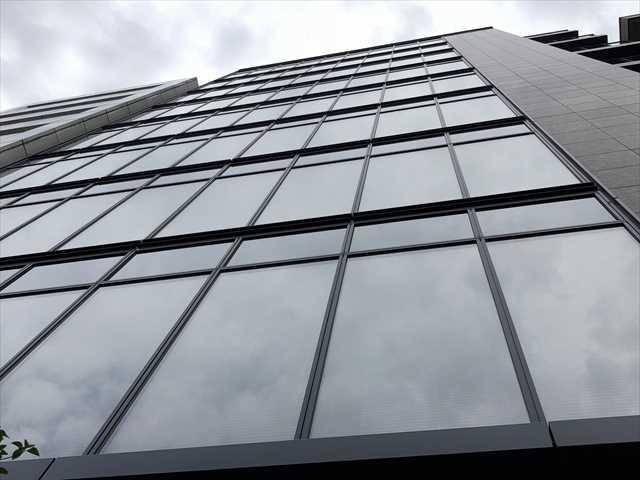 グレーの外壁にガラスカーテンウォールがスタイリッシュな外観の建物です。新耐震基準をクリアしています。