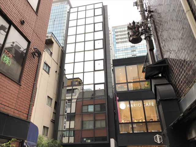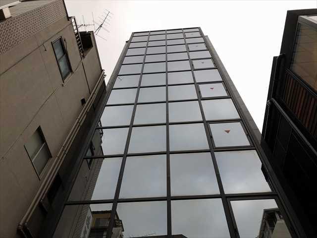 スタイリッシュなガラス張りの細身のファサードですが、両サイドの路地側に通用口のある大きなオフィスです。