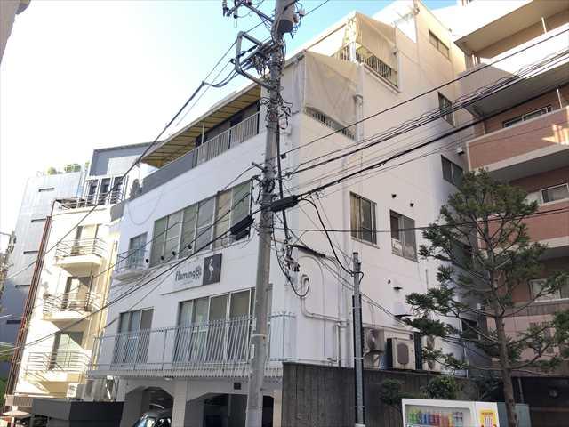 1975年竣工のオフィスビル、白い吹き付けの清潔感のある建物です。1階は駐車場になっています。