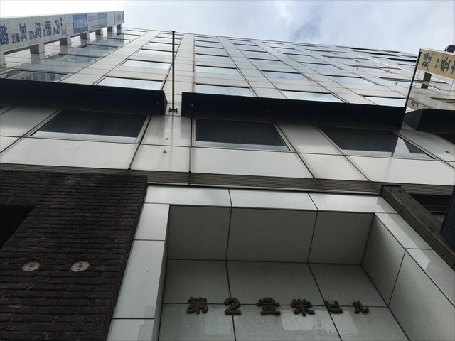 1970年竣工のオフィスビル、シルバーのパネル張りの外観、1階にはカフェや飲食店が入店していて目印になります。