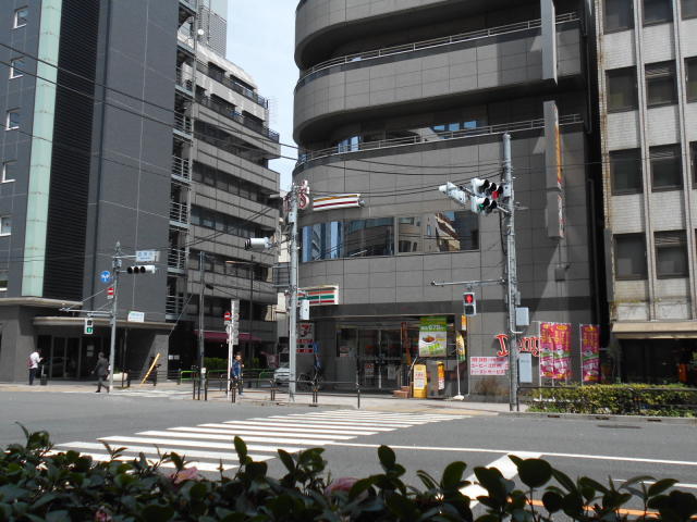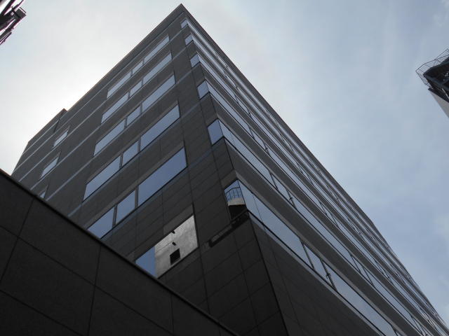1989年竣工、グレーのパネル張りの重厚感のある建物です。1階にはコンビニが入居していますので目印になります。